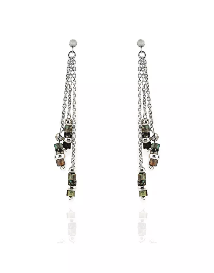 Des boucles d'oreilles pendantes en chaînes argent 925 finition brillant sur lesquelles sont suspendues des perles en marbre et en argent. Elles se composent de chaînes en Argent, de perles en Argent et de perles en marbre vert Terre.