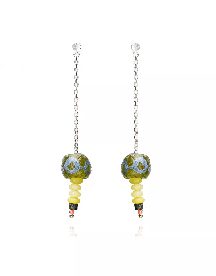 Les Boucles d'oreilles sont sublimées avec une chaîne en argent 925 finition brillant sur laquelle est accroché une Perle ethnique en verre peinte à la main de Côte d'Ivoire et des perles naturelles. Ces boucles d'oreilles se compose d'une chaîne en Argent, de perles en Serpentine vert cactus, de Perles de rocaille Miyuki Corail, de perles en marbre naturel et de perles en Verre peintes à la main.