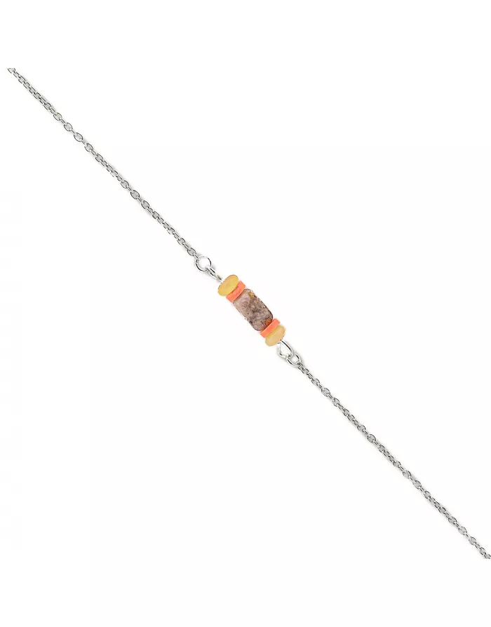 Le bracelet en argent 925 finition brillant avec son Tube de Jaspe entourée de perles naturelles. Ce bracelet se compose d'une chaîne en Argent, d'une perle en Jaspe Rose en forme de tube, de perles en Serpentine vert cactus et de Perles Heishi Katsuki en argile polymère Corail.