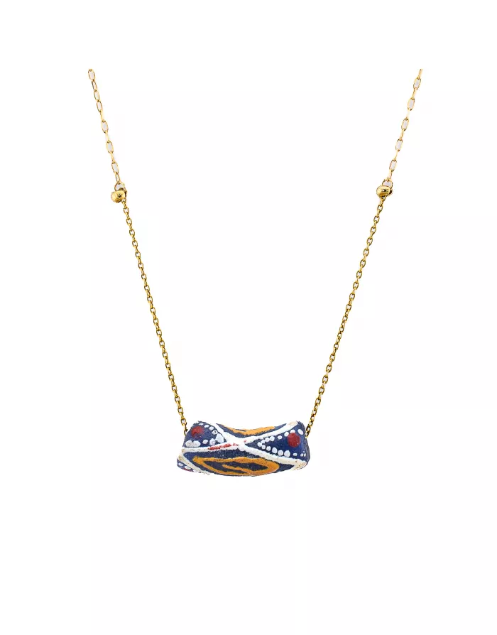 Ce collier est en argent 925 doré à l'or fin sur lequel est accroché une perle unique ethnique en provenance de Côte d'ivoire peinte à la main tel un médaillon. Il se compose d'une chaine en argent ornée d'une perle en terre cuite peinte à la main en jaune, bleu et rouge