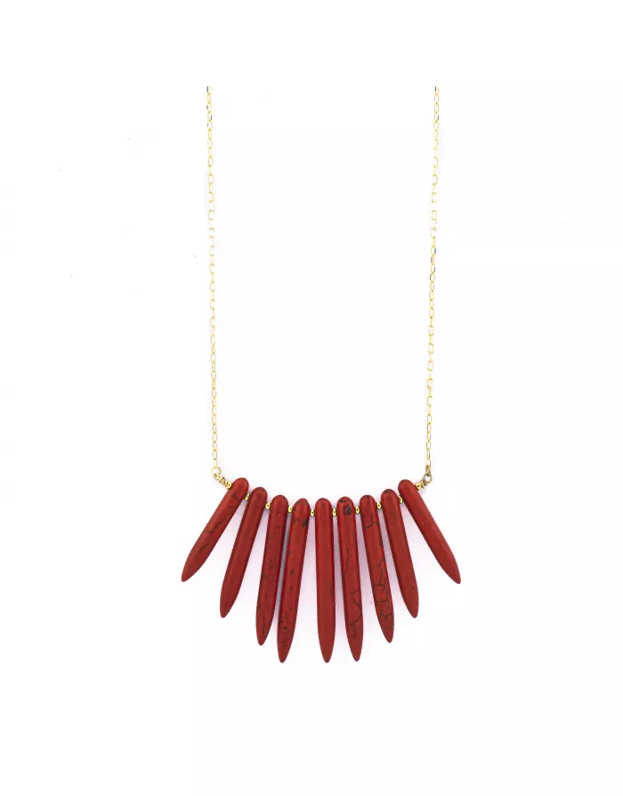 Ce sautoir en argent 925 doré à l'or fin sur lequel sont accrochées de fines perles Miyuki 24k or ainsi que de longues perles taillées en Howlite rouge couramment utilisées pour apaiser, instaurer un sentiment de quiétude. Il se compose d'une chaine en argent ornée de perles en de Howlite opaques et de perles de rocaille Miyuki 24k