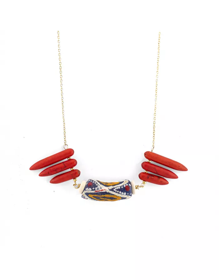 Ce Ras-de-cou en argent 925 doré à l'or fin sur lequel sont accrochées une perle ethnique centrale peinte à la main de Côte d'Ivoire  ainsi que de longues perles taillées en Howlite rouge couramment utilisées pour apaiser, instaurer un sentiment de quiétude. Il se compose d'une chaine en argent ornée de perles en de Howlite opaques et d'une perle en céramique peinte à la main