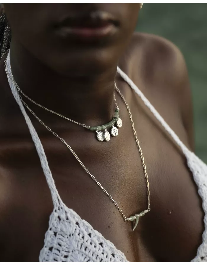 Le ras-de-cou en argent 925 finition brillant avec ses sublimes pièces de monnaie en argent et ses perles naturelles en Quartzite. Ce Collier se compose d'une chaîne en Argent et de perles en Quartzite vert cactus.