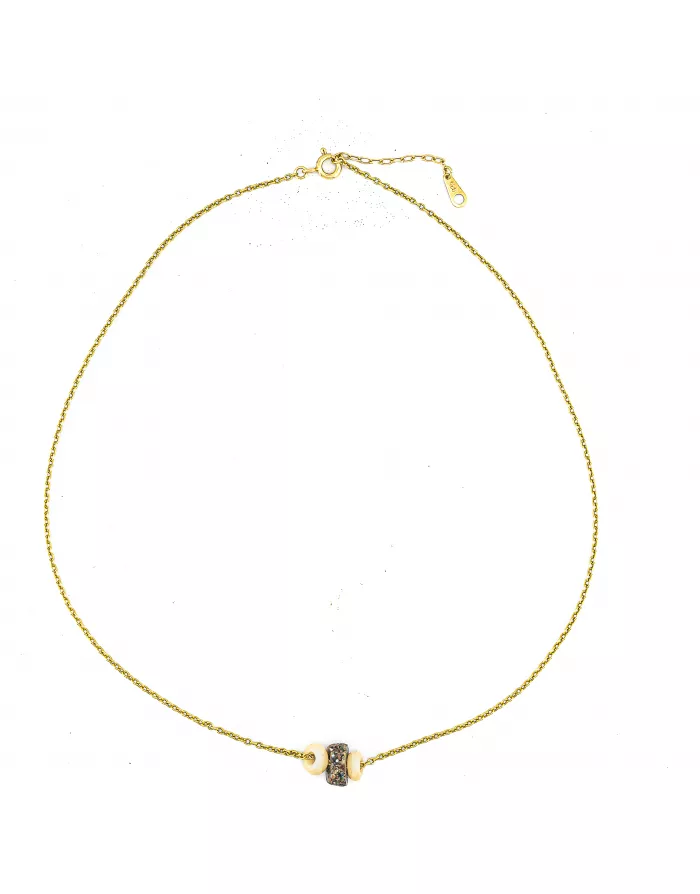 Un collier avec un pendentif en Perle Ethnique recyclée Multicolore suspendu à une chaine en argent 925 dorée à l'or fin. Il se compose d'une chaine en argent doré, d'une perle Ethnique recyclée et de deux perles en Marbre.