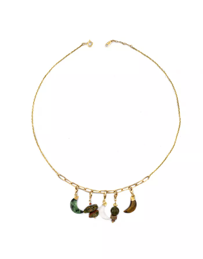 Le Ras de Cou avec ses Charms amovibles variés en pierres naturelles et argent doré à l'or fin sur une chaine large en argent doré à l'or fin.  Ce collier se compose de chaines en Argent doré, de Pierres naturelles en Granit, Calcédonite , en Quartz et en Pierre de Lune
