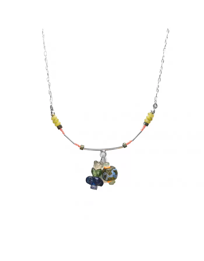 Le Collier en argent 925 finition brillant avec ses tubes et son anneau en argent sur lequel est accroché des perles naturelles et des perles en verre recyclé de la Côte d'Ivoire. Ce Collier se compose d'une chaîne en Argent, de tubes en argent, de perles en Serpentine vert cactus, de Perles Heishi Katsuki en argile polymère Corail, de Perles de rocaille Miyuki Corail, de perles en marbre naturel et de perles en Verre recyclé.