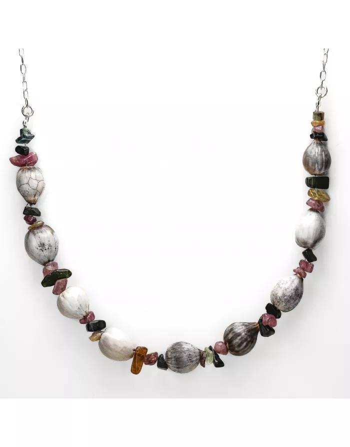 Le ras de cou en argent 925 fini brillant orné de graine de larmes de Job provenant du Cameroun et des pierres naturelles. Ce collier se compose d'Argent brillant, de graines de job naturelles grisse, de perles chips tourmaline roses.
